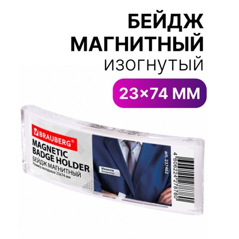 )Горизонтальный изогнутый бейдж-табличка BRAUBERG MAGNETIC для именных карточек. Безопасное и надежное крепление на двух магнитах.