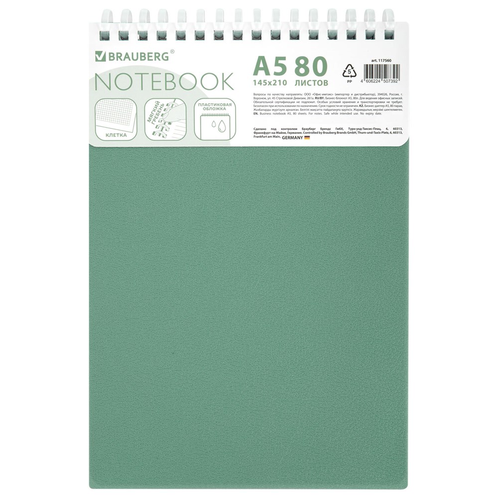 Блокнот А5, 80 л., силиконовый гребень, обложка пластик, клетка, BRAUBERG, зеленый, 117560