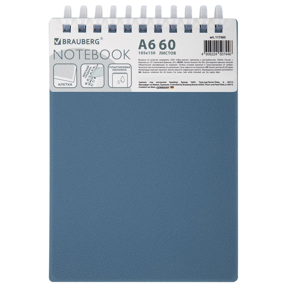 Стильный и практичный блокнот BRAUBERG – идеальный помощник для записей, заметок и планирования. Прочная пластиковая обложка надежно защищает страницы от повреждений и долго сохраняет безупречный внешний вид.Прочная пластиковая обложка надежно защищает внутренний блок от повреждений и влаги, продлевая срок службы блокнота. Обложка из пластика имеет фактурную поверхность под кожу. Внутри – 60 листов высококачественной офсетной бумаги плотностью 70 г/м2 и белизной 100%, обеспечивающей комфортное письмо. Линовка блока – клетка. Листы скреплены мягким силиконовым гребнем, что обеспечивает удобство использования блокнота. Блокнот формата А6 – это компактное и удобное решение для быстрых записей в любом месте. Он легко помещается в карман, сумку или рюкзак, что делает его идеальным для повседневного использования.