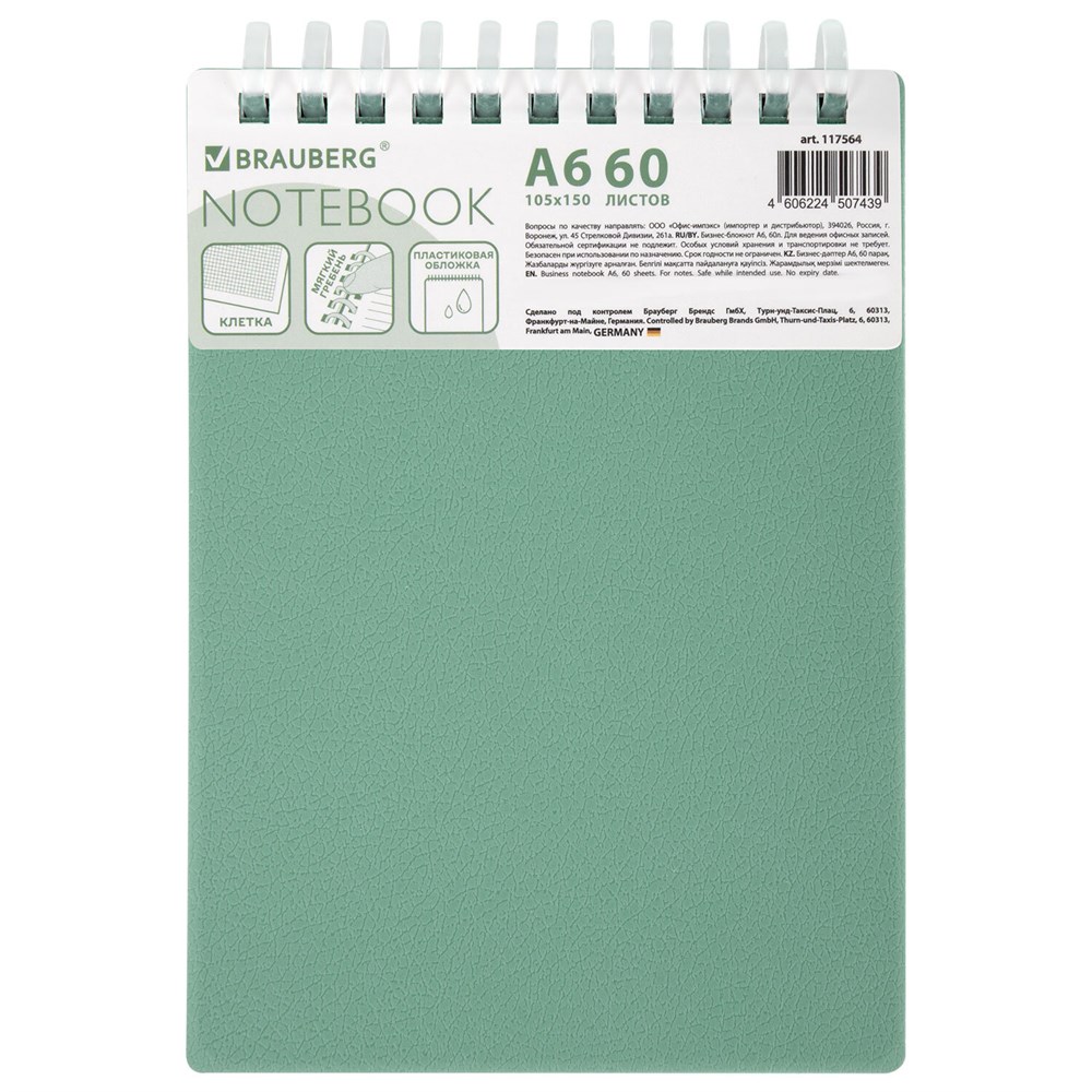 Блокнот МАЛЫЙ ФОРМАТ А6, 60 л., силиконовый гребень, обложка пластик, клетка, BRAUBERG, зеленый, 117564