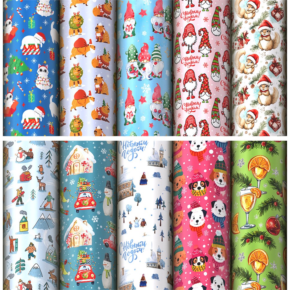 Бумага упаковочная новогодняя "Веселый Новый Год", 70х100 см, 10 дизайнов ассорти, ЗОЛОТАЯ СКАЗКА, 592563