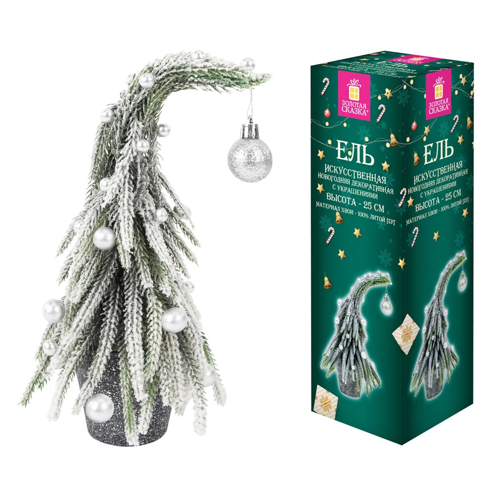Елка-гном ЗОЛОТАЯ СКАЗКА станет прекрасным украшением для дома или офиса. Елка преобразит пространство и подарит ощущение праздника.Заснеженная ель высотой 25 см представляет собой конструкцию из пластикового каркаса и закрепленных к нему ветвей.
