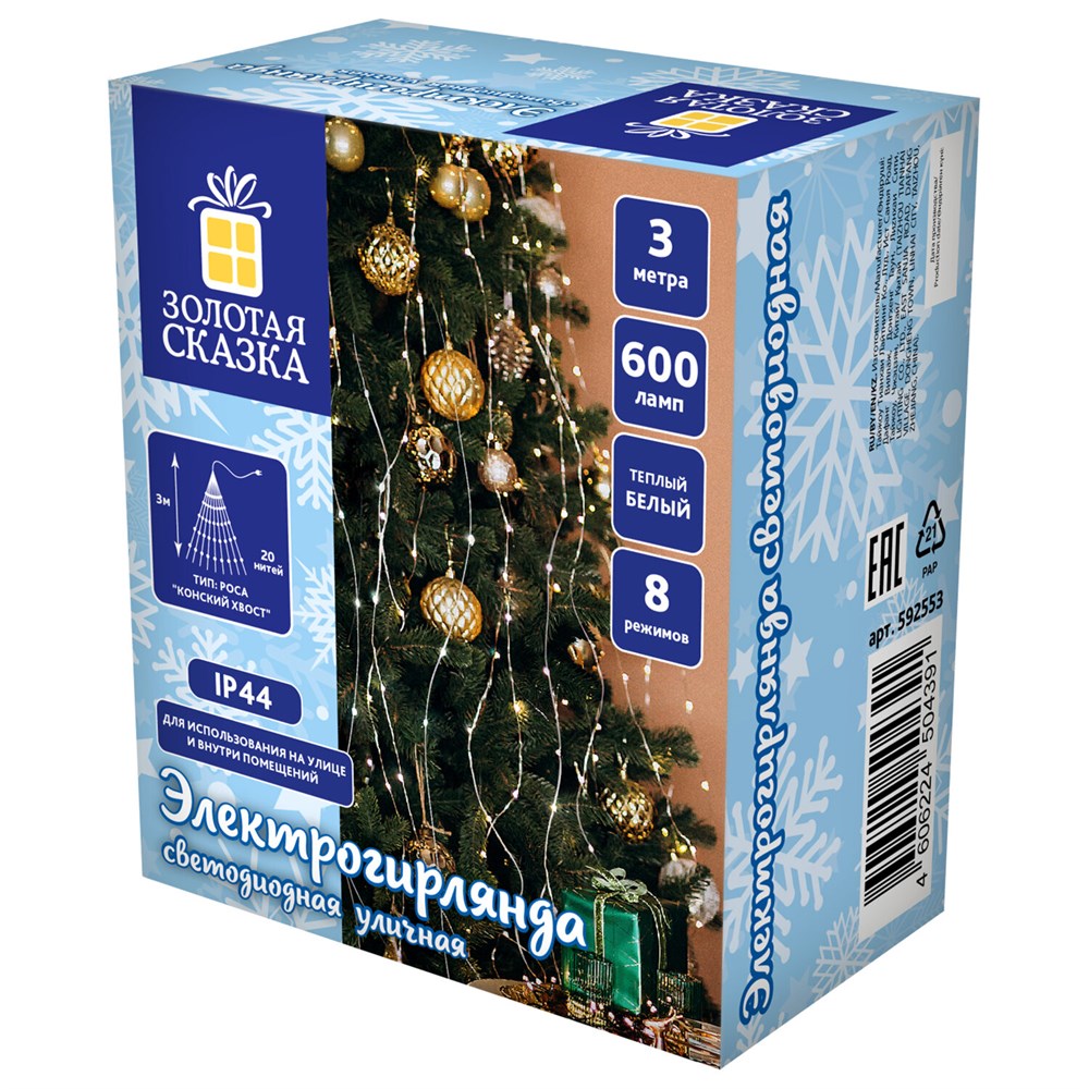 Электрогирлянда-конский хвост уличная, 3 м, 600 LED, тёплый белый, 220 V, контроллер, ЗОЛОТАЯ СКАЗКА, 592553