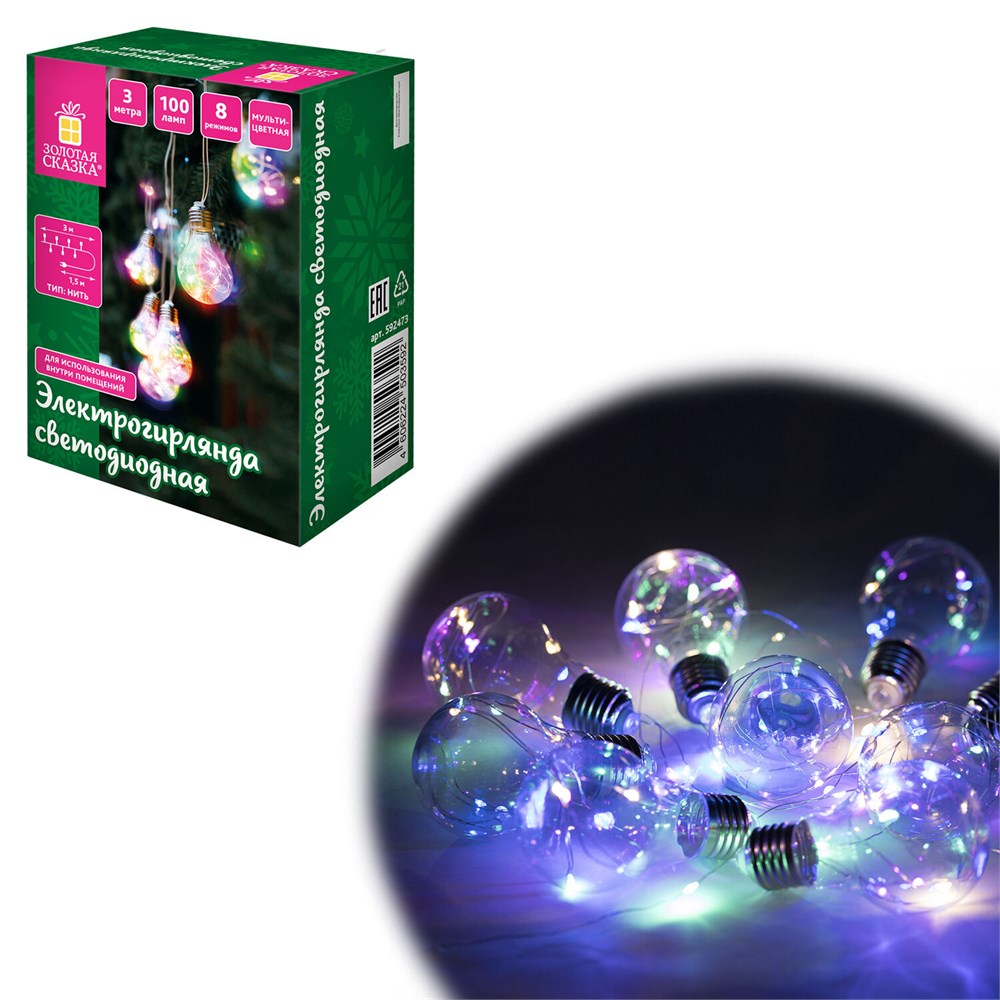 Электрогирлянда-нить комнатная "Лампочки", 3 м, 100 LED, мультицветная, 220 V, контроллер, ЗОЛОТАЯ СКАЗКА, 592473