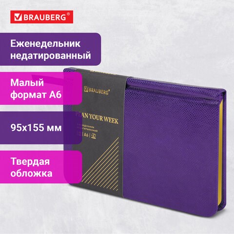 Еженедельник недатированный МАЛЫЙ ФОРМАТ 95х155 мм, А6, BRAUBERG "Iguana", под кожу, 64 л., сиреневый, 114482