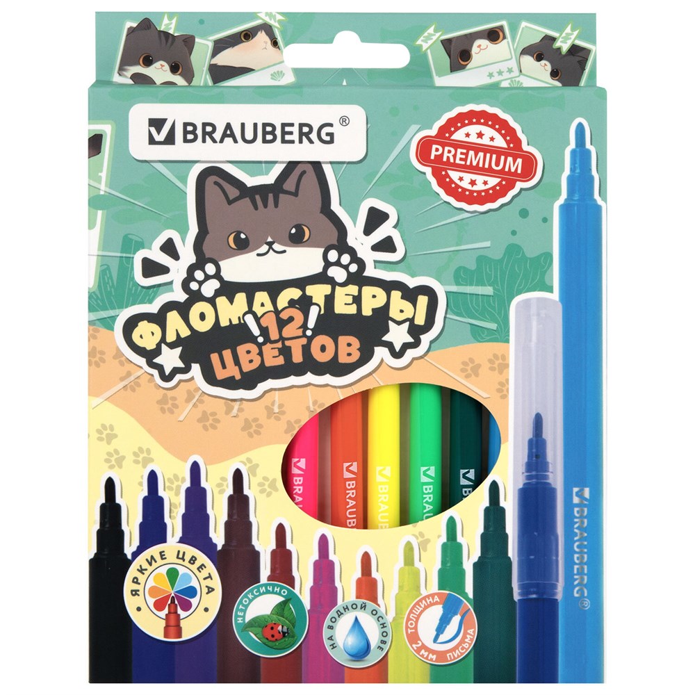 Фломастеры кросс-серия МИЛЫЕ КОТЫ, 12 цветов, вентилируемый колпачок, картонная коробка с европодвесом, BRAUBERG, 152620