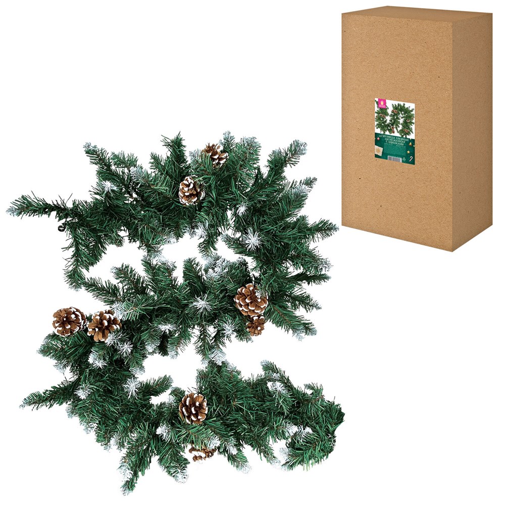 Гирлянда выполнена из ПВХ, имитирующего свежие хвойные ветки, покрытые пушистым снегом. В комплекте – настоящие деревянные шишки, которые добавляют природный акцент и делают декор ещё более живым и тёплым.