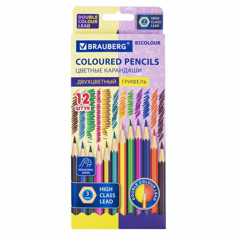 )Шестигранные деревянные цветные карандаши с двухцветным грифелем BRAUBERG серии BICOLOUR обеспечивают гладкое письмо благодаря мягкому грифелю. Особое качество красящего пигмента делает цвета яркими и насыщенными.