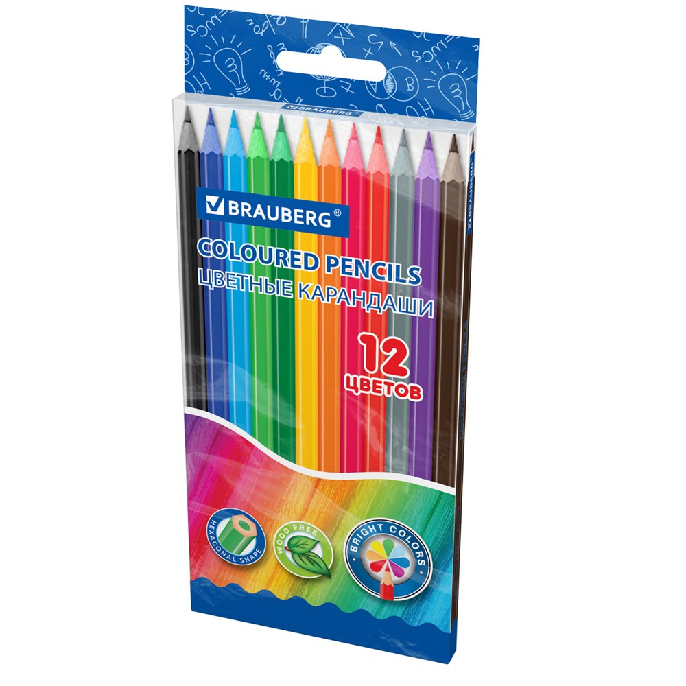 Цветные карандаши высокого качества BRAUBERG обеспечивают гладкое письмо благодаря мягкому грифелю. Особое качество красящего пигмента обеспечивает насыщенные яркие цвета.Набор состоит из 12 цветов: черный, синий, голубой, салатовый, зеленый, желтый, оранжевый, розовый, красный, серый, фиолетовый, коричневый. Шестигранная форма сечения корпуса позволяет не скатываться карандашу с поверхности стола во время занятий рисованием. Карандаши изготовлены из высококачественного цветного пластика и имеют лакированный корпус. Качество исполнения гарантирует легкую заточку. Грифель диаметром 3 мм обладает повышенной прочностью. Все карандаши заточены и поставляются в прозрачной пластиковой коробке с европодвесом.