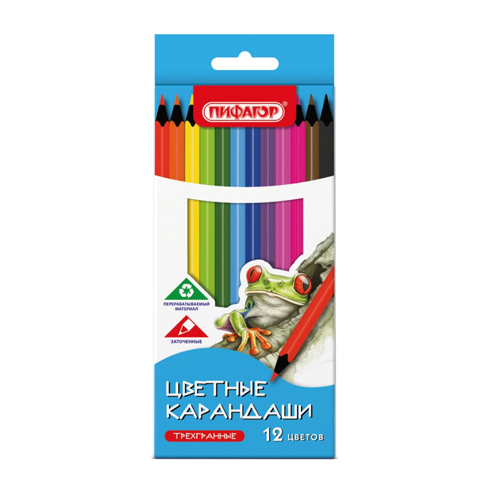 Цветные карандаши ПИФАГОР "СТАНДАРТ" предназначены для детского творчества. Коробка с ярким оформлением порадует как детей дошкольного и младшего школьного возраста, так и взрослых.Набор состоит из 12 самых популярных цветов: красный, розовый, оранжевый, жёлтый, телесный, коричневый, зелёный, лимонный, голубой, синий, фиолетовый, чёрный. Трехгранная форма сечения корпуса удобна в использовании и позволяет карандашу не скатываться с поверхности стола во время занятий рисованием. Карандаши изготовлены из нетоксичного переработанного пластика. Корпус при разломе не образует острые края и безопасен для детей. Грифель легко затачивается и обладает повышенной прочностью. Все карандаши заточены и поставляются в картонной упаковке с европодвесом.