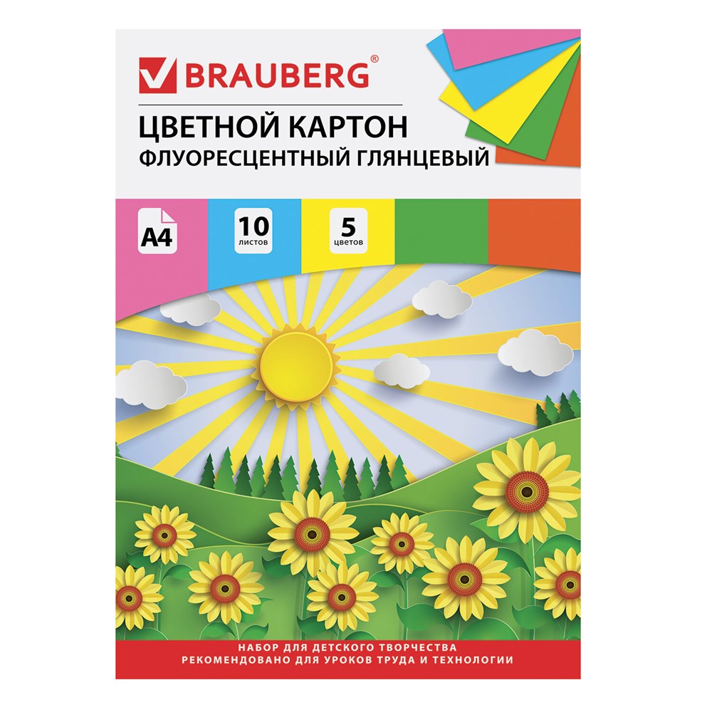 Картон цветной А4 МЕЛОВАННЫЙ (глянцевый), ФЛУОРЕСЦЕНТНЫЙ, 10 листов 5 цветов, в папке, BRAUBERG, 200х290 мм, "Лето", 129918