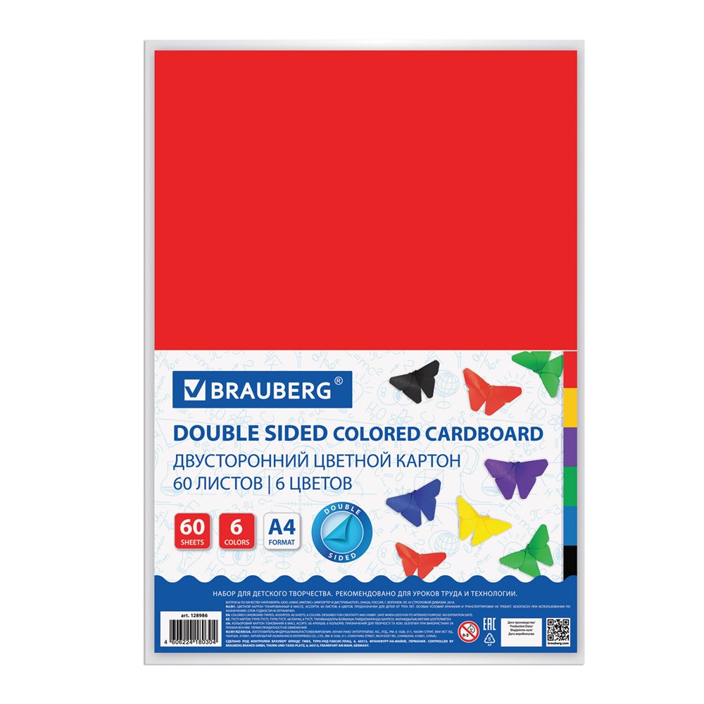 Картон цветной А4 ТОНИРОВАННЫЙ В МАССЕ, 60 листов, 6 цветов, 220 г/м2, BRAUBERG, 210х297 мм, 128986
