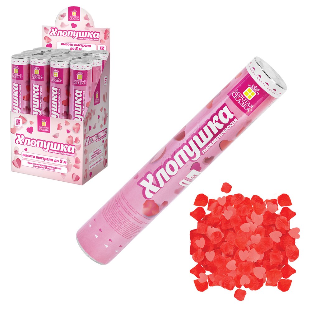 Хлопушка пневматическая 30 см "Сердечки и лепестки", бумага, розовый/красный, ЗОЛОТАЯ СКАЗКА, 592458