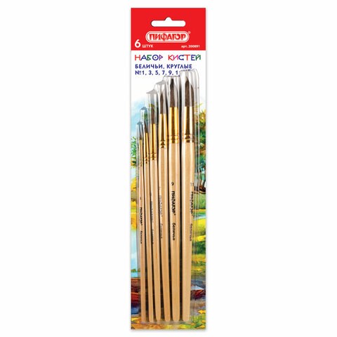Кисти ПИФАГОР, набор 6 шт. (БЕЛКА: круглые № 1, 3, 5, 7, 9, 11), блистер с европодвесом, 200891