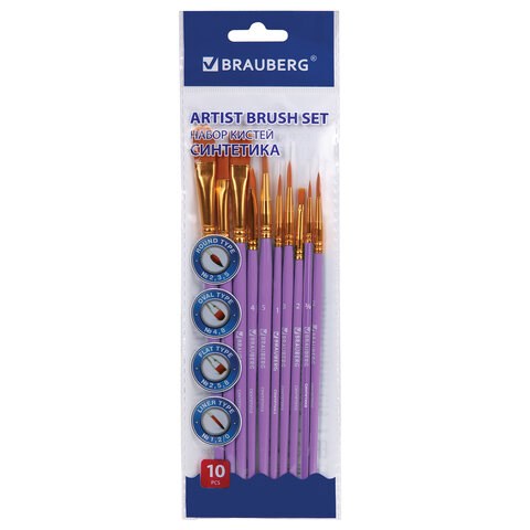 Кисти синтетика BRAUBERG, НАБОР 10 шт., фиолетовые (Круглые; Овальные; Плоские; Лайнеры), 201029