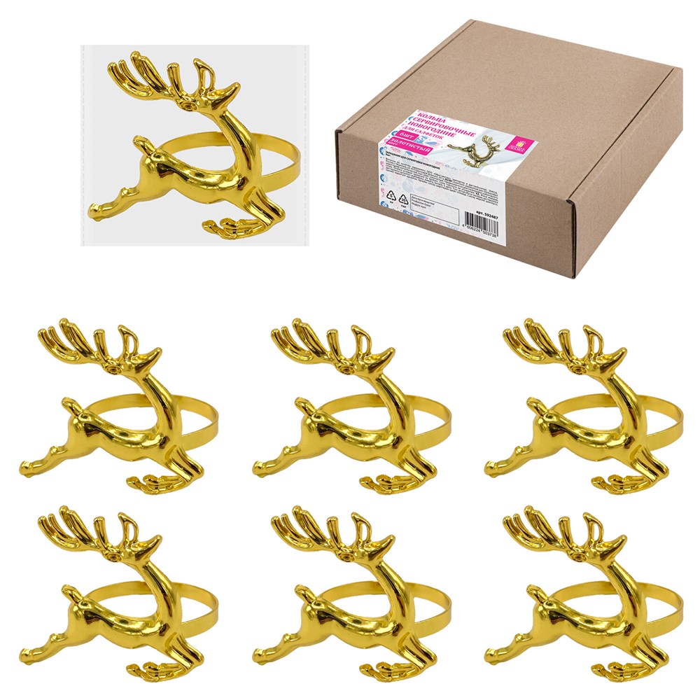 Новогодние кольца для салфеток в форме оленей ЗОЛОТАЯ СКАЗКА – уютный акцент на праздничном столе! Эти небольшие детали создают атмосферу тепла и радости, превращая обычное застолье в настоящий праздник.Комплект сервировочных колец ЗОЛОТАЯ СКАЗКА состоит из 6 штук. Кольца выполнены из металла золотистого цвета.
