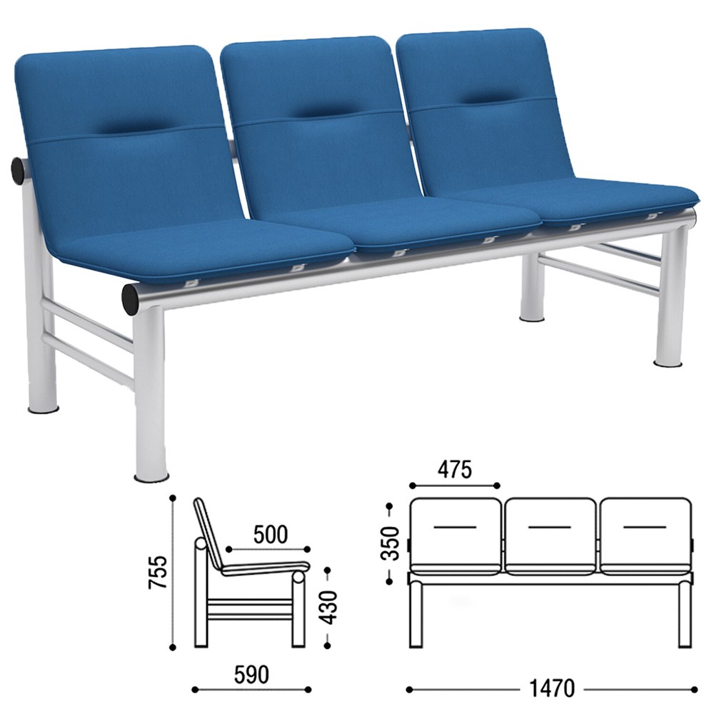 Кресло для посетителей трехсекционное "Троя", 755х1470х590 мм, светлый каркас, кожзам синий, СМ 105-03 К20