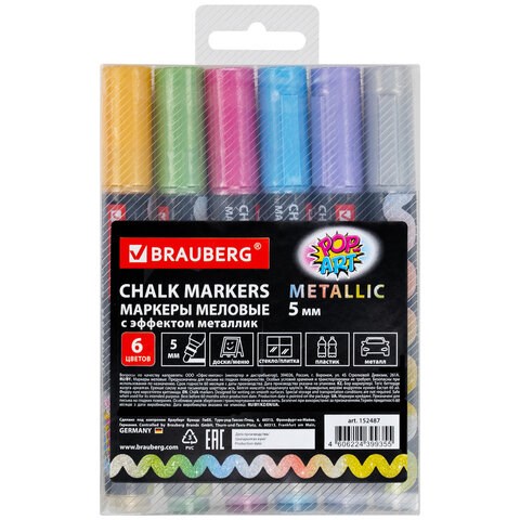Маркеры меловые "POP-ART", НАБОР 6 ЦВЕТОВ МЕТАЛЛИК, 5 мм, ВЛАГОСТИРАЕМЫЕ, BRAUBERG, 152487