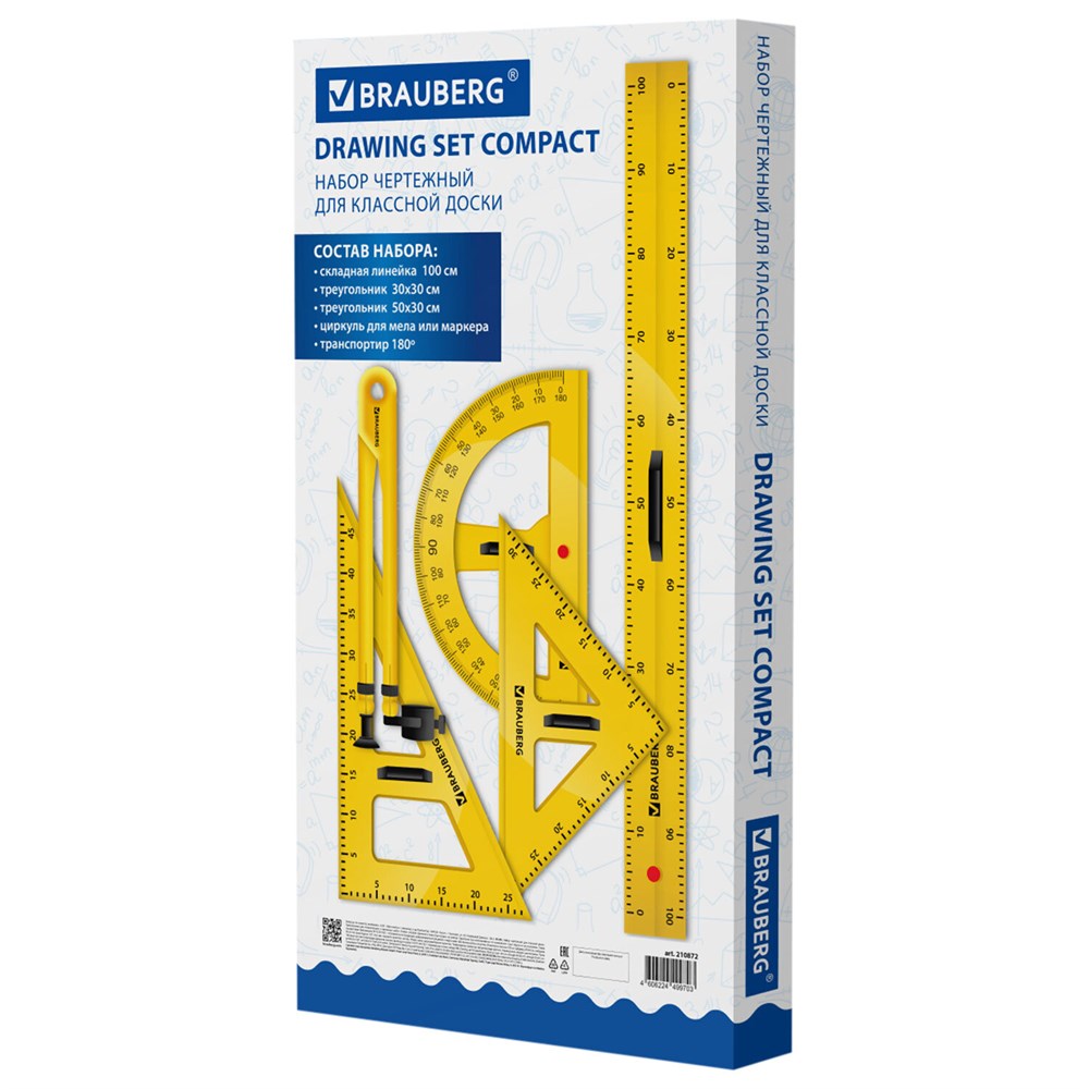 Набор чертежный для классной доски Compact (2 треугольника, транспортир, циркуль, складная линейка 100 см), BRAUBERG, 210872