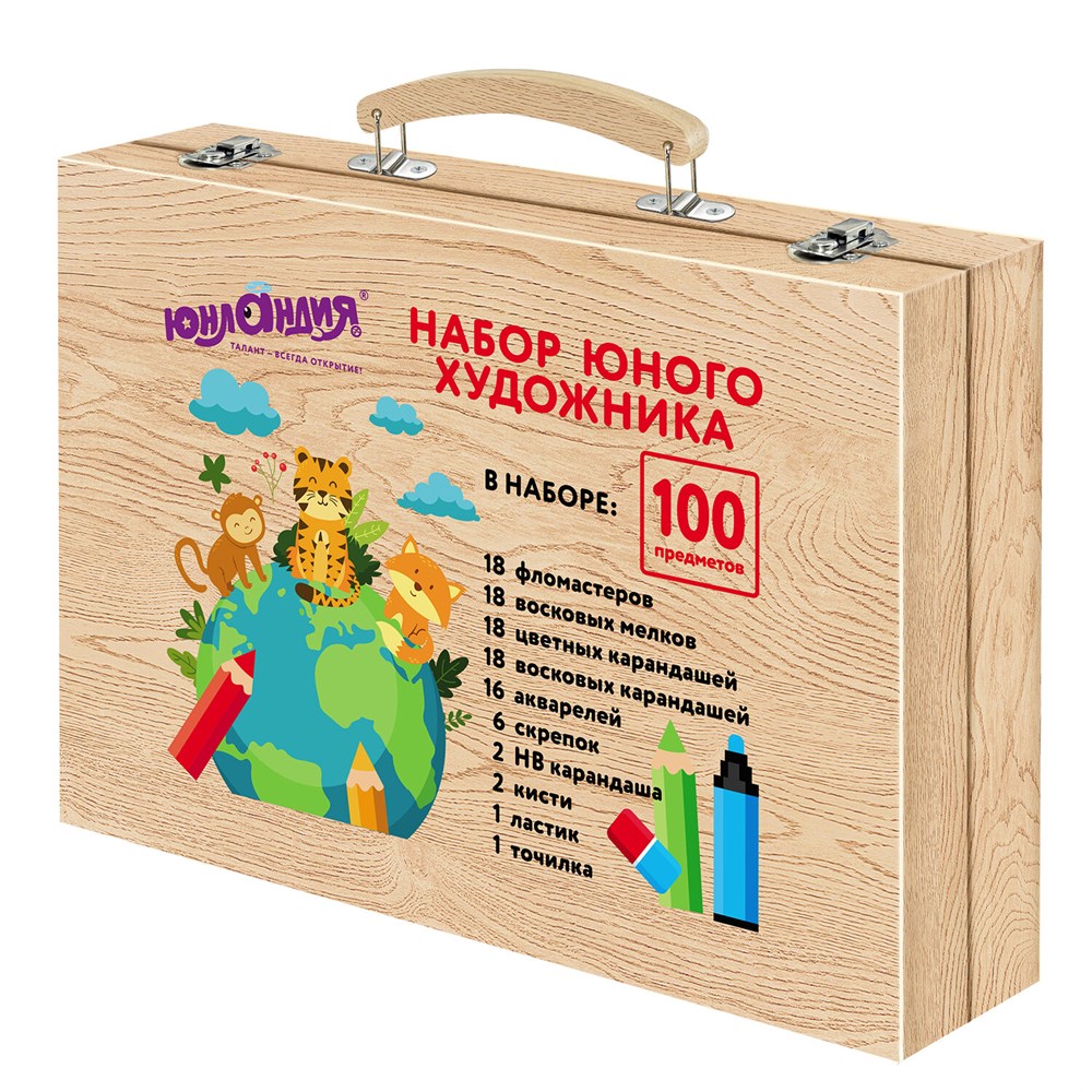 Набор юного художника ЮНЛАНДИЯ отлично подойдет для первых шагов в рисовании. В красочном кейсе есть все самые необходимые предметы для развития творческих способностей ребенка. Набор хорошо развивает усидчивость, воображение, образное мышление.Набор представляет собой кейс с красочным дизайном и грамотно подобранным наполнением из 100 предметов. Кейс раскладывается как книга. Каждый предмет надежно закреплен в ячейке. Надежный корпус кейса гарантирует полную защиту внутреннего наполнения от повреждений. Набор надежно упакован в термоусадку и короб из гофрокартона. Углы кейса дополнительно защищены от повреждений при транспортировке. Набор удобно брать с собой в школу или в поездку.