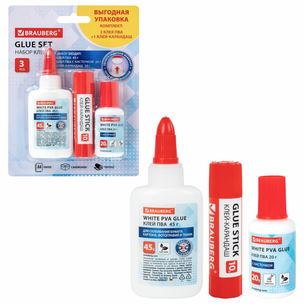 Набор клея BRAUBERG (клей-карандаш PVP 10 г, клей ПВА 45 г, клей ПВА 20 г с кисточкой), блистер, 271978