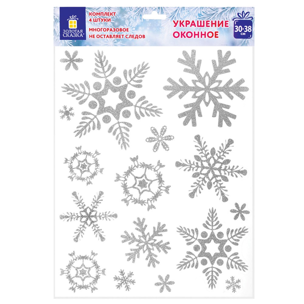 Украшение для окон и стекла ЗОЛОТАЯ СКАЗКА – это отличный и недорогой способ украсить домашний или офисный интерьер к новогодним праздникам. Такой декор наполнит комнату волшебной атмосферой и подарит праздничное настроение.Комплект наклеек с изображением снежинок изготовлен из поливинилхлорида (ПВХ). Каждый лист с наклейками размером 30x38 см декорирован серебристым глиттером. В комплекте 4 листа, на каждом – 16 снежинок.