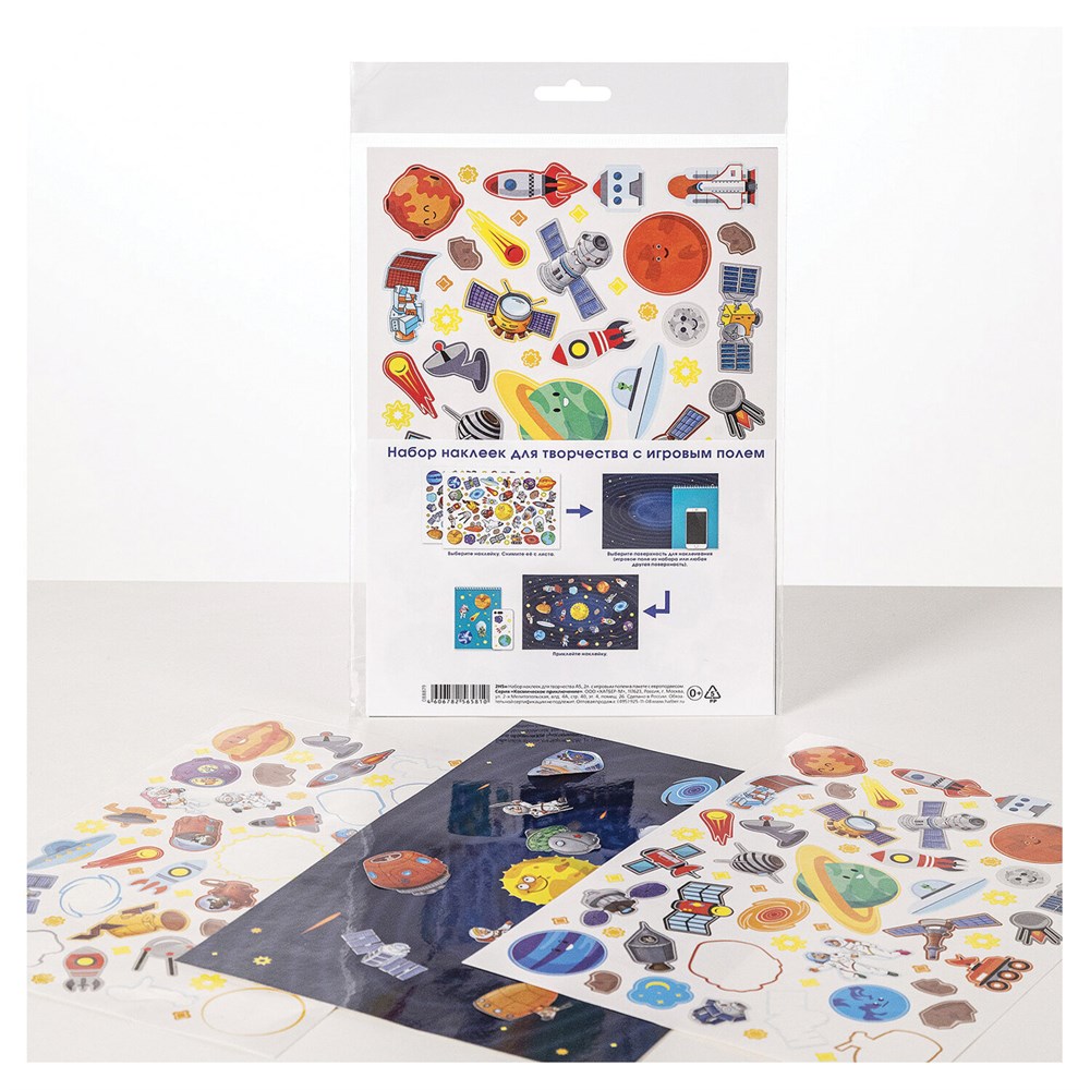 Наклейки с игровым полем "Космическое приключение" HATBER – креативный набор для детского творчества!Набор наклеек для творчества "Космическое приключение" включает в себя два листа с большим количеством ярких тематических наклеек. Кроме того, в комплект входит игровое поле формата А5, на которое можно наклеивать картинки-наклейки, с удовольствием погрузившись в творческий процесс. Также наклейки можно использовать для украшения смартфонов, блокнотов, тетрадей и оформления открыток и подарков.