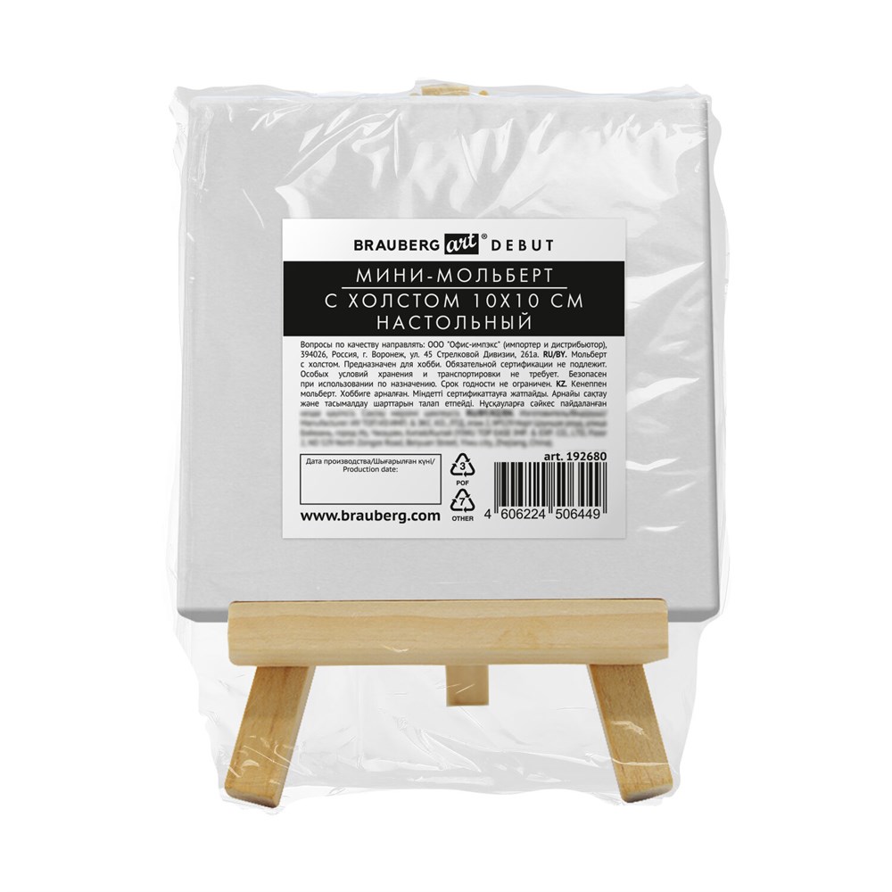 Размер мольберта – 15х8 см. Размер холста – 10х10 см. Набор упакован в термоусадку.
