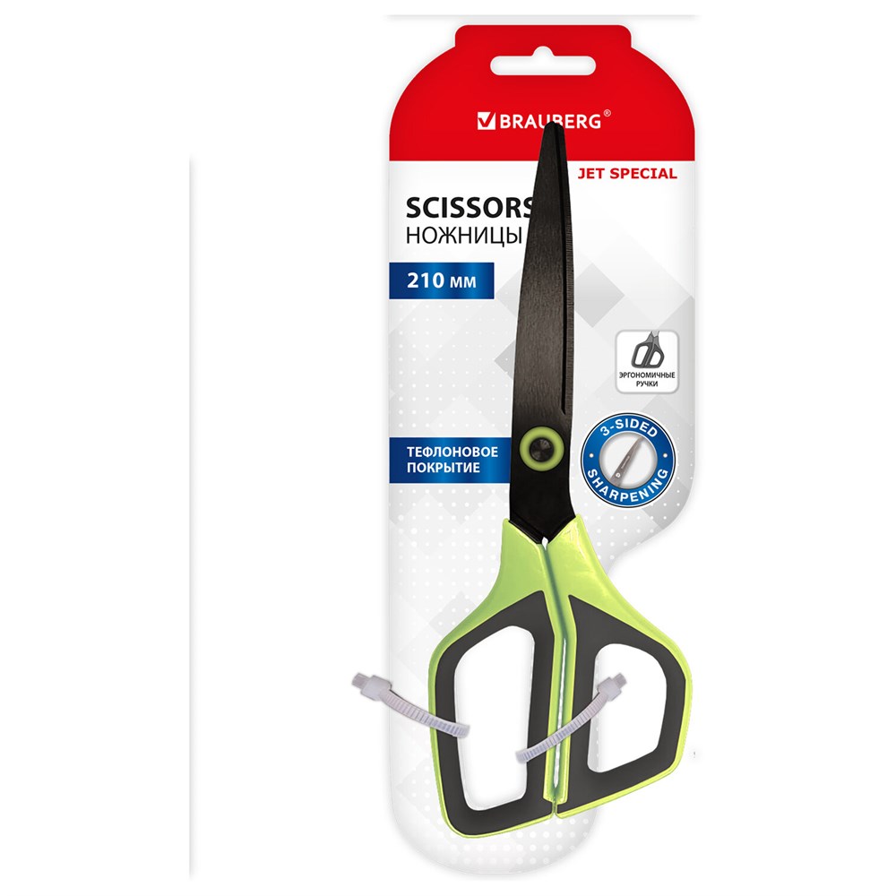 Ножницы BRAUBERG "JET Special", салатовые, 210 мм, 3-х сторонняя заточка, тефлоновое покрытие, 238852