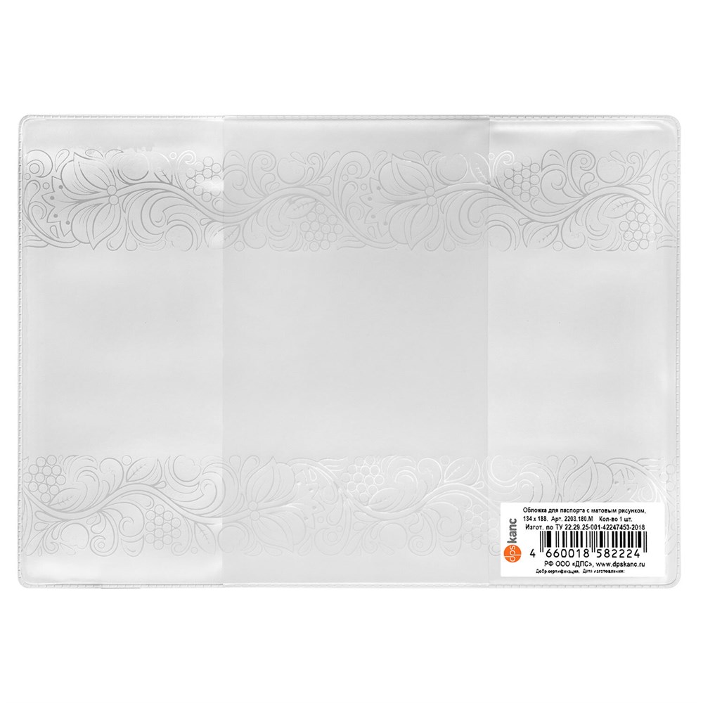 Обложка из ПВХ для паспорта и трудовой книжки нового образца ДПС с прозрачным рисунком надежно защитит документ от изнашивания и придаст аккуратный внешний вид.Обложка для паспорта (подходит также для трудовой книжки нового образца) имеет приятную матовую фактуру с прозрачным рисунком. Плотность обложки – 180 мкм. Размер – 134х188 мм.