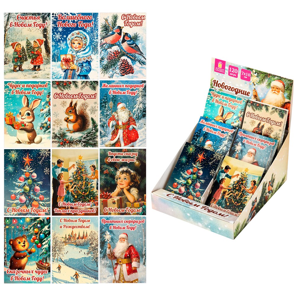 Открытка новогодняя (1 шт.), 7х10 см, "Ретро", картон, ассорти 12 дизайнов, ЗОЛОТАЯ СКАЗКА, 592582
