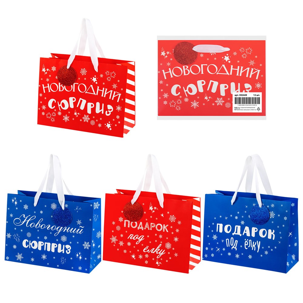 Подарочный пакет новогодний изготовлен из ламинированного мелованного картона, снабжен ленточными ручками из полиэстера. К каждому пакету прикреплен круглый хэнгтэг, на обратной стороне которого можно оставить свои теплые пожелания, сделав подарок еще ближе и трогательнее. А лицевая сторона хэнгтэга покрыта красным и синим глиттером, что делает его ярким завершающим акцентом. Каждый пакет украшен очаровательными надписями и рисунками в новогодней тематике (ассорти без возможности выбора). Размер – 27х11х20 см.