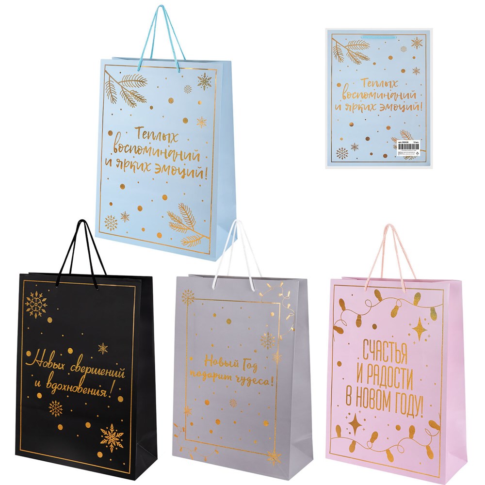 На каждом пакете написаны новогодние пожелания, что делает пакет частью поздравления. Можно просто вручить его с добрыми словами – и он всё скажет за Вас. Дополнительные элементы декора – маленькие снежинки и звёздочки – создают атмосферу праздника и добавляют каждому пакету особую магию в сочетании с переливающимся голографическим эффектом на всех деталях рисунка. Размер – 33x13x45 см.