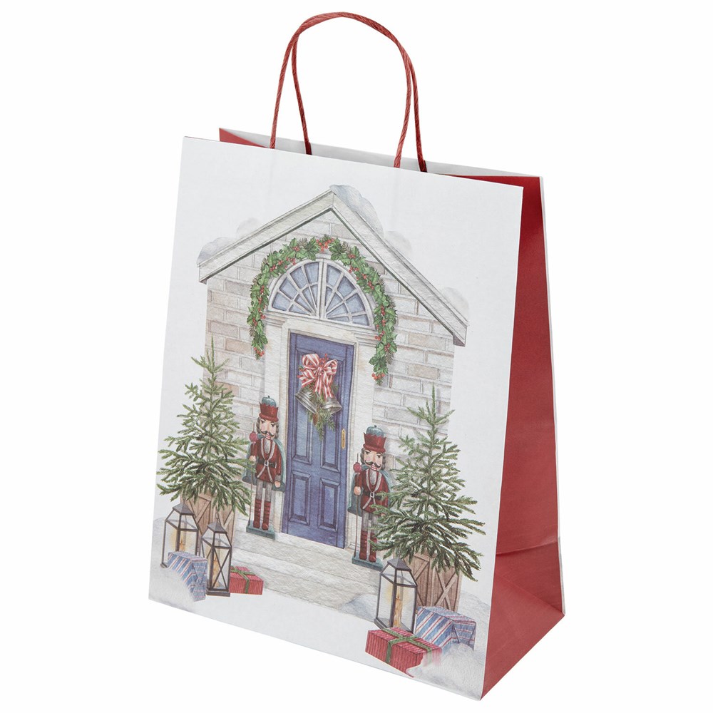 Подарочный пакет новогодний изготовлен из крафт-бумаги, снабжен бумажными ручками. Размер – 26x13x32 см. Пакет украшен изображением новогодних атрибутов.