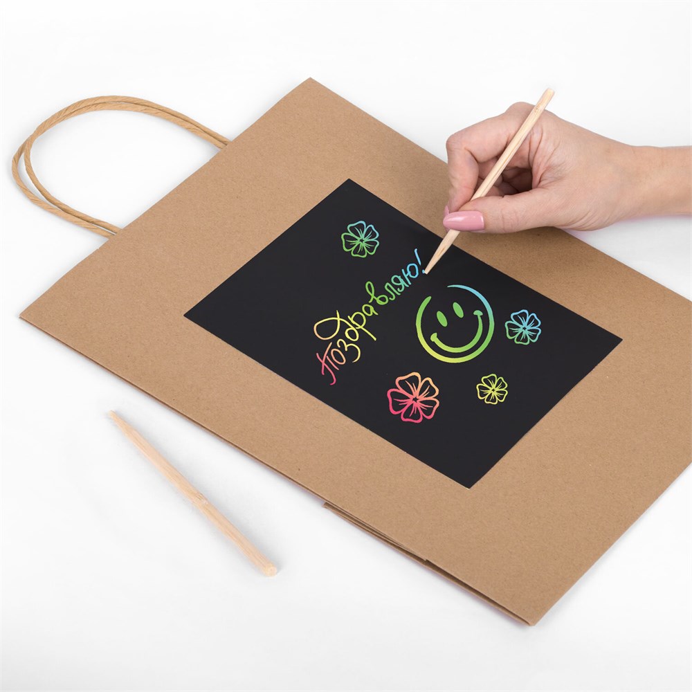 В комплект подарочных пакетов из крафт-бумаги также входят бумажные ручки, скретч-слой с одной стороны пакета и два бамбуковых стилуса. Размер – 32x13x26 см. Пакеты однотонного цвета.