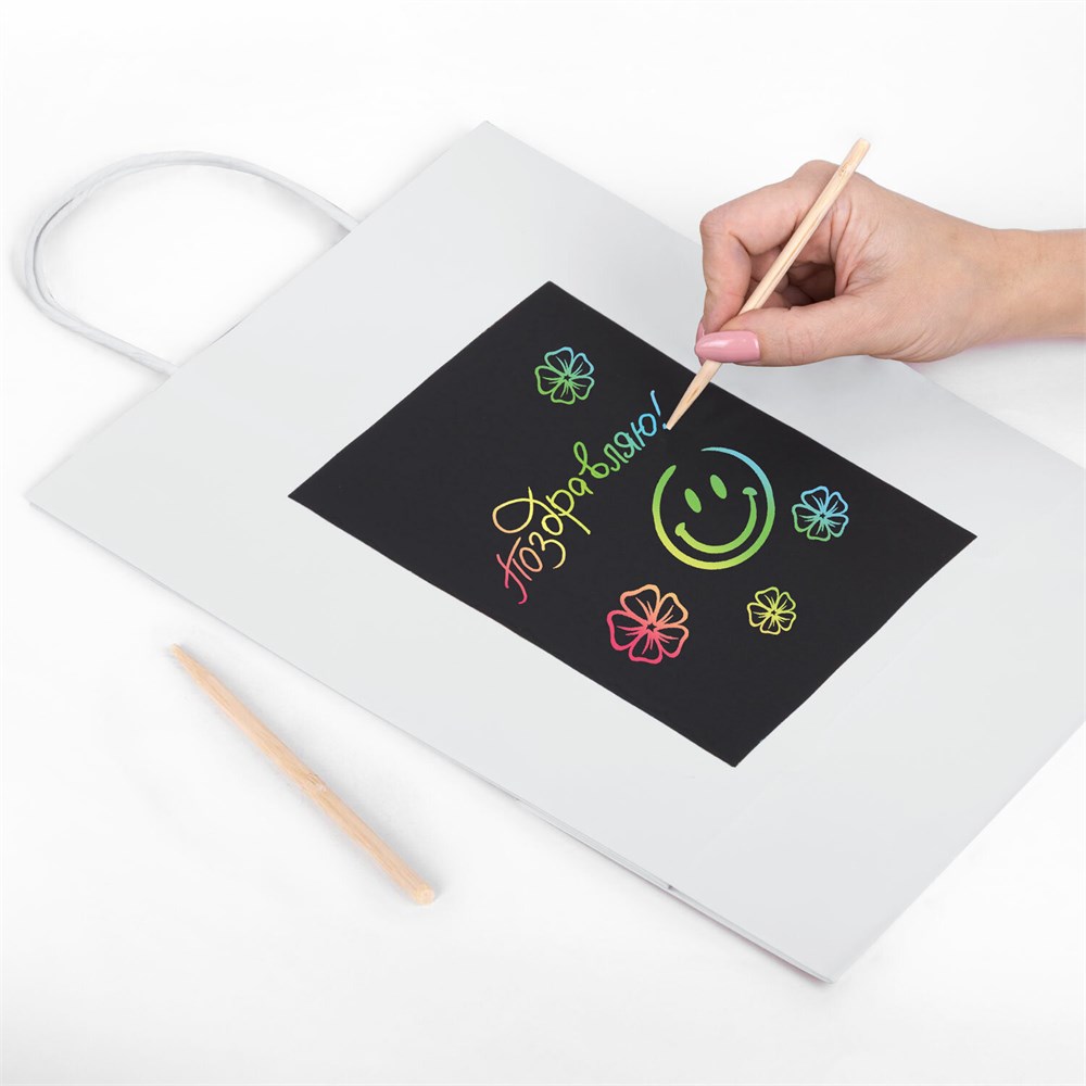 В комплект подарочных пакетов из крафт-бумаги также входят бумажные ручки, скретч-слой с одной стороны пакета и два бамбуковых стилуса. Размер – 32x13x26 см. Пакеты однотонного цвета.