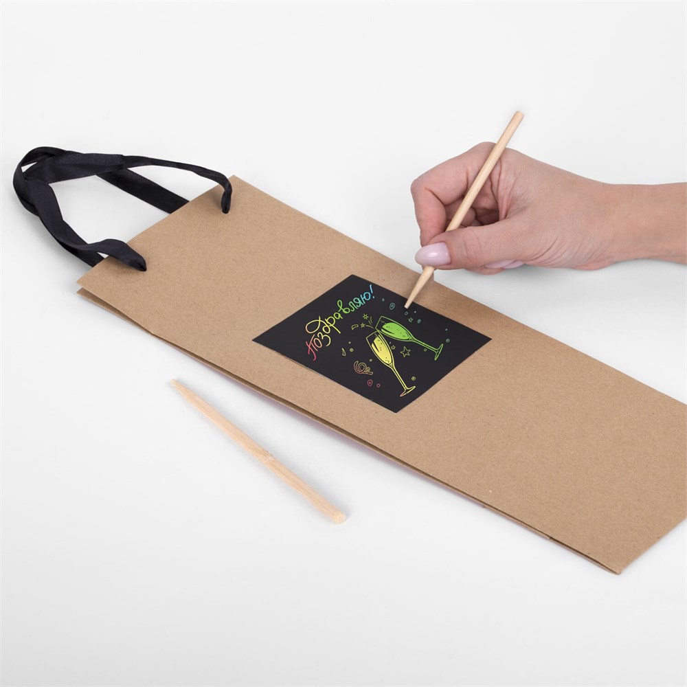 В комплект подарочных пакетов из крафт-бумаги с ленточными ручками из полиэстера входят два бамбуковых стилуса и скретч-слой с одной стороны пакета. Размер – 36x8x13 см. Пакеты однотонного цвета.