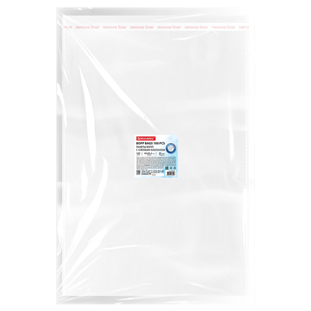 Пакеты БОПП с клеевым клапаном КОМПЛЕКТ 100 штук, 40х60+4 см, 30 мкм с усиленным швом, BRAUBERG, 700412