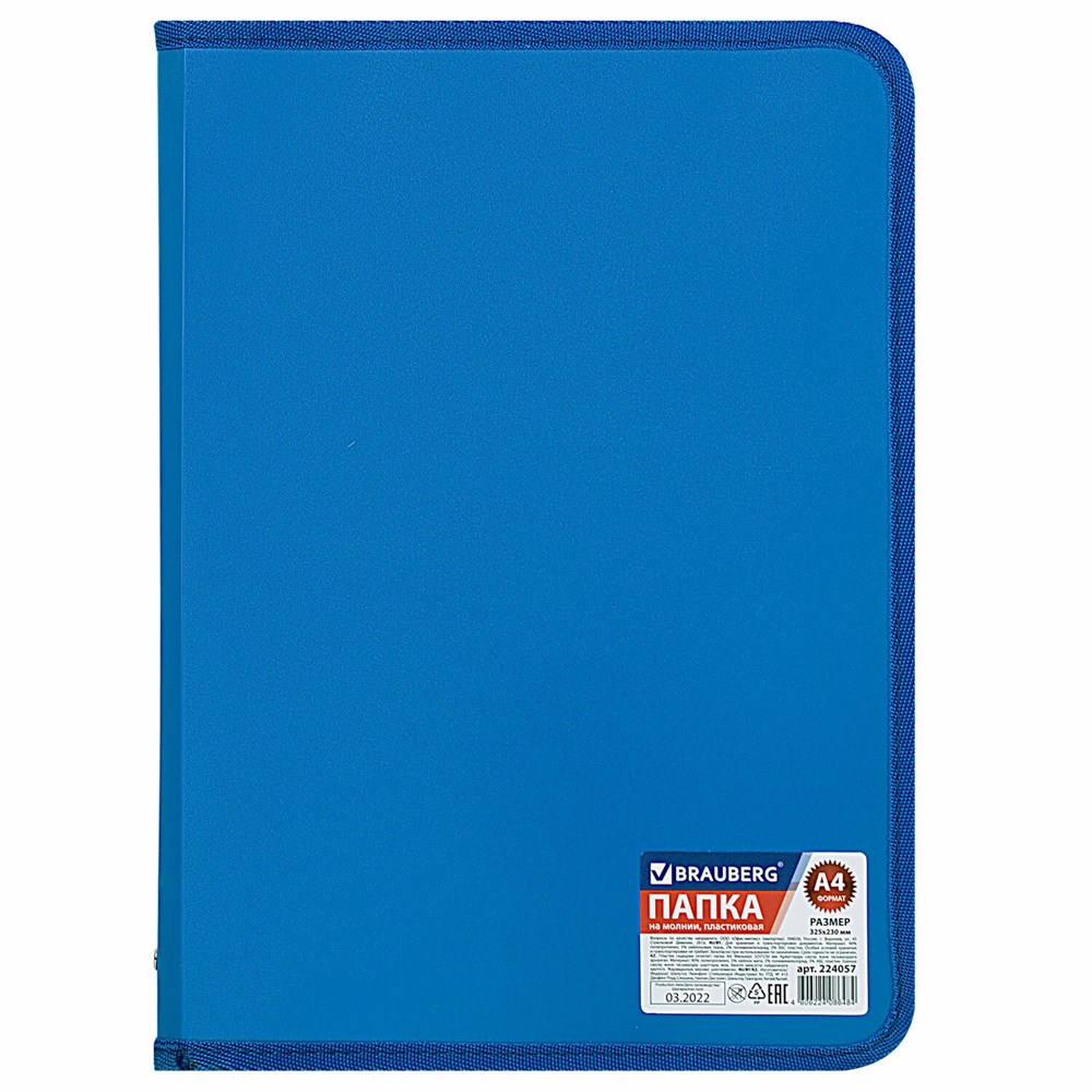 Папка на молнии пластиковая BRAUBERG "Стандарт", стандартная фактура, А4, 325х230 мм, матовая, синяя, 224057
