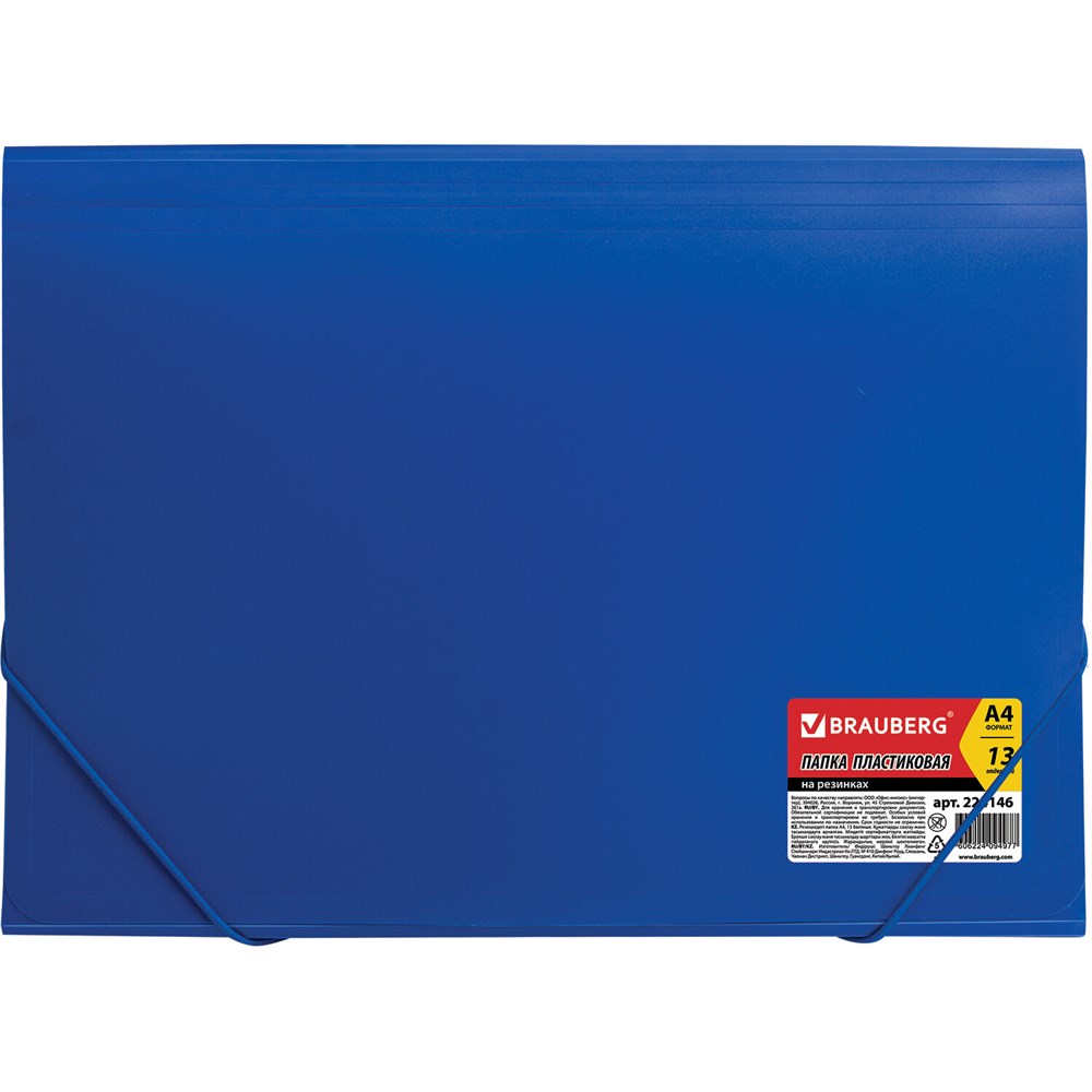 Папка на резинках BRAUBERG "Business", А4, 13 отделений, пластиковый индекс, синяя, 0,5 мм, 224146