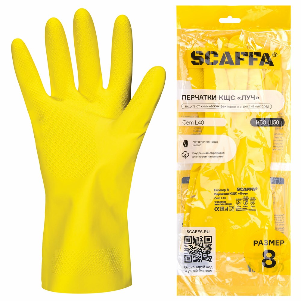 Перчатки латексные SCAFFA "Луч", КЩС-2, хлопчатобумажное напыление, размер 8, M (средний), желтые, 00-01017717