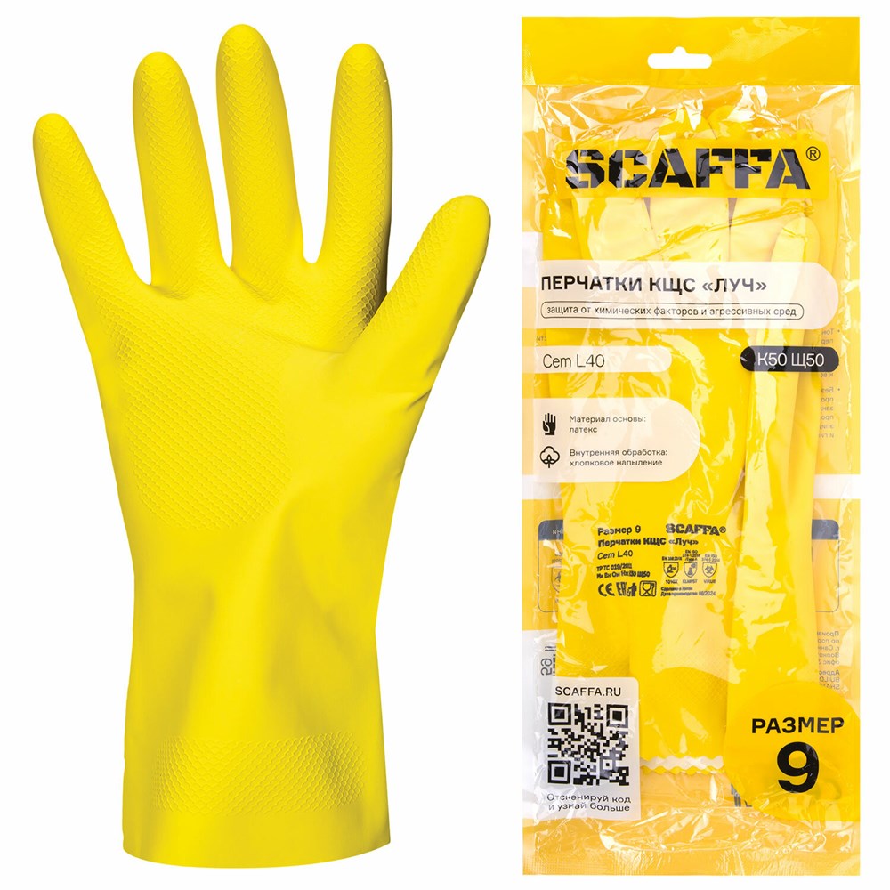 Перчатки латексные SCAFFA "Луч", КЩС-2, хлопчатобумажное напыление, размер 9, L (большой), желтые, 00-01017718