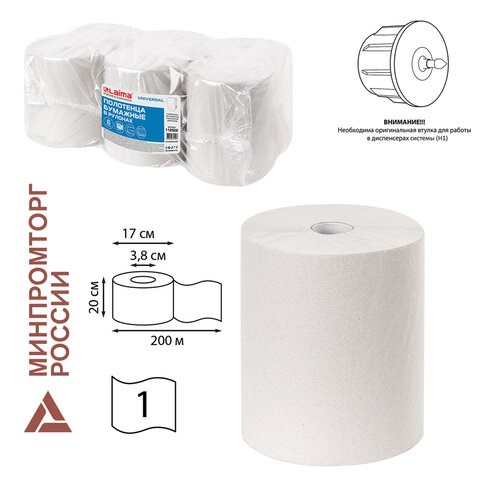 )Бумажные полотенца в рулонах LAIMA UNIVERSALПодходят к диспенсерным системам H1 ПРИ ИСПОЛЬЗОВАНИИ ОРИГИНАЛЬНЫХ ВТУЛОК от расходных материалов H1.
