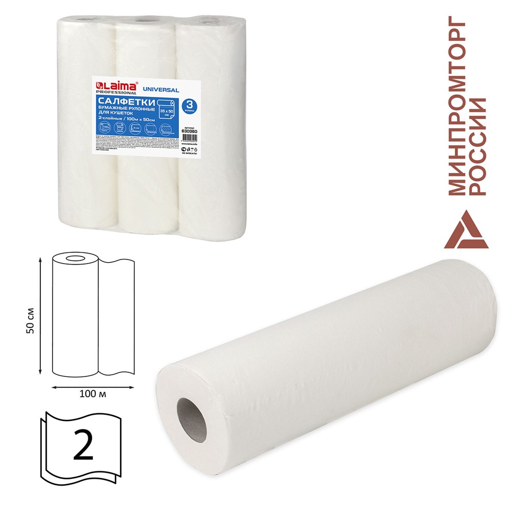 Простыни бумажные рулонные с перфорацией LAIMA UNIVERSAL КОМПЛЕКТ 3 шт., 2-слойные, 0,5х100 м, 17+17 г/м2, 630360, БС-2-ПР/100