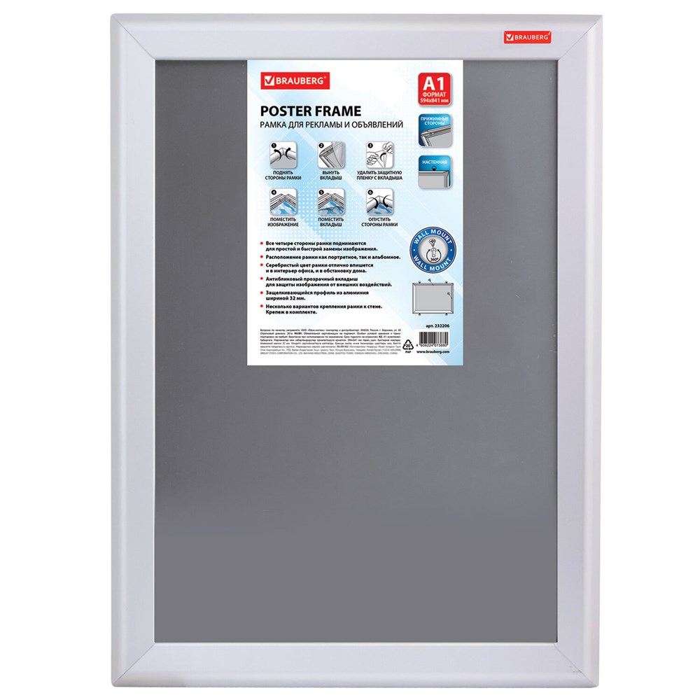 Настенная рамка BRAUBERG актуальна для рекламных носителей, объявлений и документов, требующих частой замены.Нет необходимости снимать рамку со стены - достаточно поднять прижимные стороны рамки, вынуть антибликовый прозрачный вкладыш и вставить новое изображение. Расположение рамки как портретное, так и альбомное. Элементы крепления прилагаются. Максимальная высота вставляемого листа - 841 мм, максимальная ширина вставляемого листа - 594 мм.