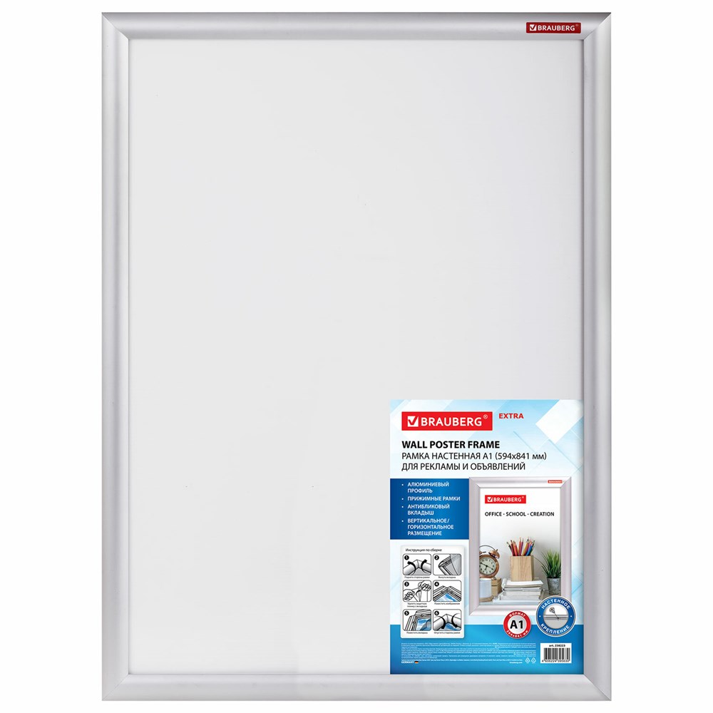 Рамка настенная с защелкивающимся профилем BRAUBERG "Extra" предназначена для размещения печатных материалов. Идеально подходит для использования в офисе, торговых залах, пунктах выдачи, медицинских и других учреждениях.Профиль рамки изготовлен из анодированного алюминия. Изменяемое расположение – книжное или альбомное. Благодаря прозрачному антибликовому покрытию документы отчётливо видны посетителю, не мнутся и не загрязняются в течение всего эксплуатационного периода. Рамка крепится к стене через специальные отверстия при помощи дюбелей и саморезов. Элементы крепления входят в комплект. Максимальная высота вставляемого листа – 841 мм, максимальная ширина вставляемого листа – 594 мм. Цвет рамки – матовое серебро. Ширина багета – 2,5 см.