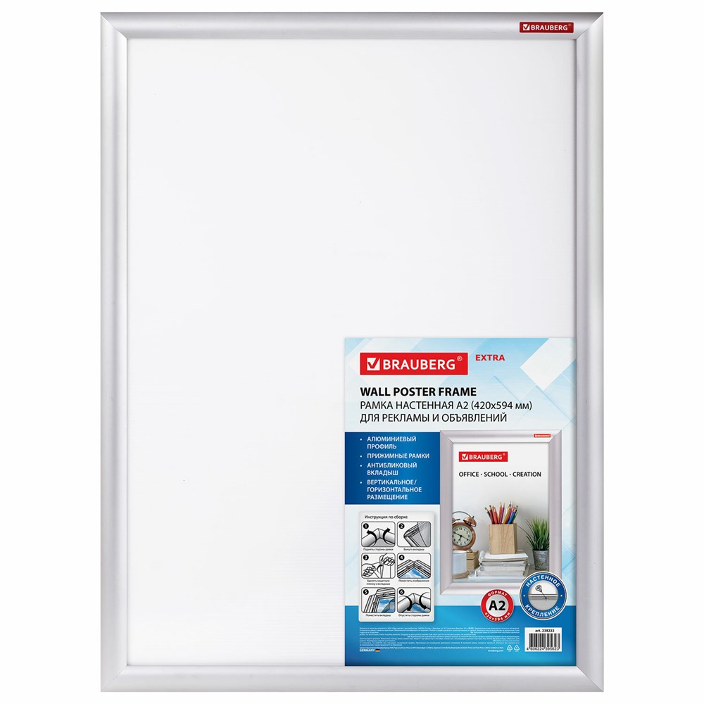 Рамка настенная с защелкивающимся профилем BRAUBERG "Extra" предназначена для размещения печатных материалов. Идеально подходит для использования в офисе, торговых залах, пунктах выдачи, медицинских и других учреждениях.Профиль рамки изготовлен из анодированного алюминия. Изменяемое расположение – книжное или альбомное. Благодаря прозрачному антибликовому покрытию документы отчётливо видны посетителю, не мнутся и не загрязняются в течение всего эксплуатационного периода. Рамка крепится к стене через специальные отверстия при помощи дюбелей и саморезов. Элементы крепления входят в комплект. Максимальная высота вставляемого листа – 594 мм, максимальная ширина вставляемого листа – 420 мм. Цвет рамки - матовое серебро. Ширина багета – 2,5 см.