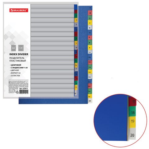Разделитель пластиковый BRAUBERG, А4, 20 листов, цифровой 1-20, оглавление, цветной, РОССИЯ, 225611
