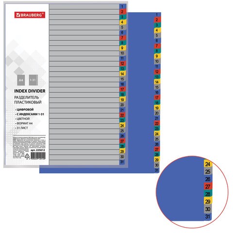 Разделитель пластиковый BRAUBERG, А4, 31 лист, цифровой 1-31, оглавление, цветной, РОССИЯ, 225612