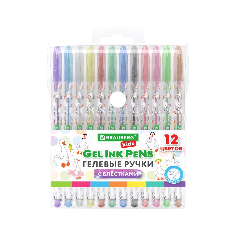 Ручки гелевые С БЛЕСТКАМИ BRAUBERG KIDS "CUTE ANIMALS", НАБОР 12 ЦВЕТОВ, корпус с печатью, узел 1 мм, линия письма 0,7 мм, 144446